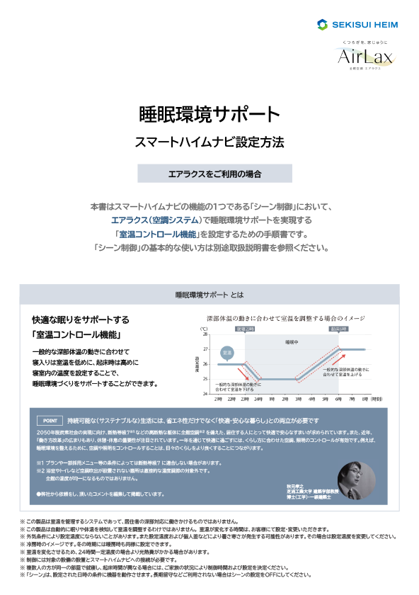 本書はスマートハイムナビの機能の1つである「シーン制御」において、エアラクス(空調システム)で睡眠環境サポートを実現する「室温コントロール機能」を設定するための手順書です。