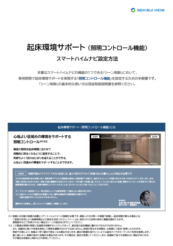 本書はスマートハイムナビの機能の1つである「シーン制御」において、専用照明で起床環境サポートを実現する「照明コントロール機能」を設定するための手順書です。